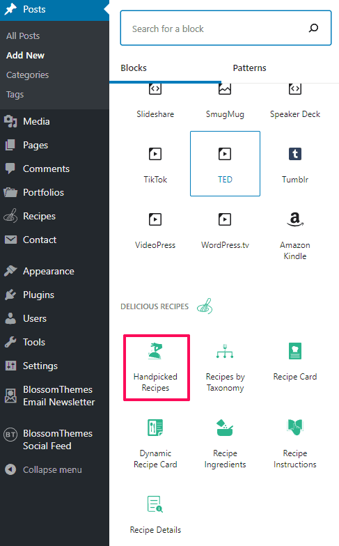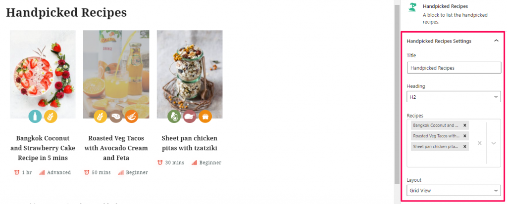 WP Delicious plugin also has the option to display only selected recipe posts on a page or a page. To do so, you can use the Handpicked Recipe block. To configure this block, please follow the instructions below.