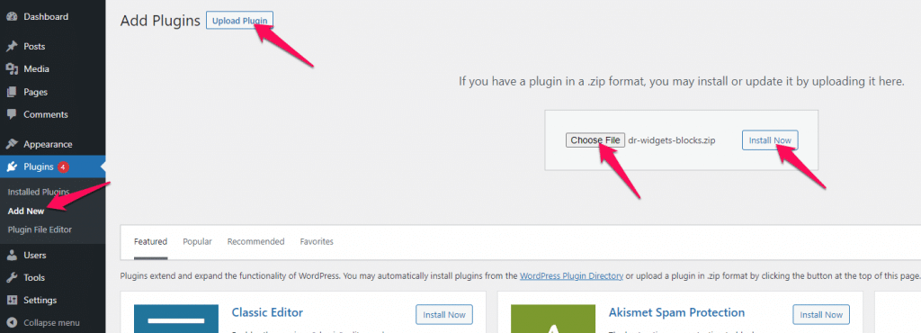To upload the ZIP file, navigate to your Dashboard > Plugins > Add New > Upload Plugin. Now click on the Choose file option to locate the downloaded ZIP file or simply drag and drop the file to this button.