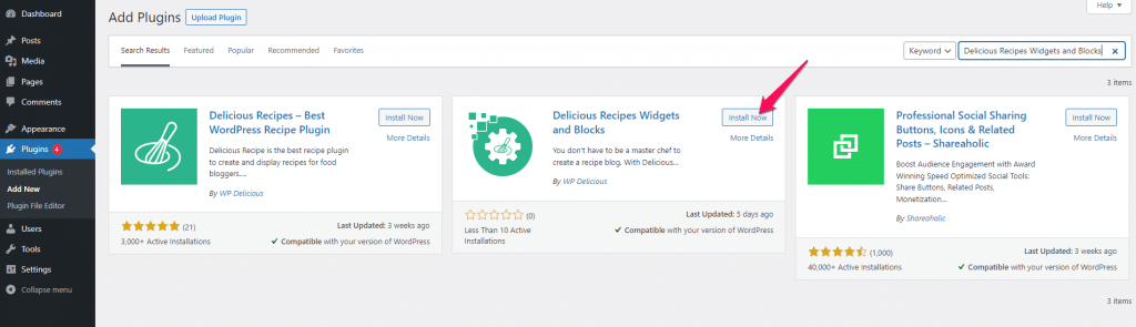 To install the plugin, navigate to your Dashboard > Plugins > Add New. In the search field, type Delicious Recipes Widgets and Blocks and hit the Enter key.