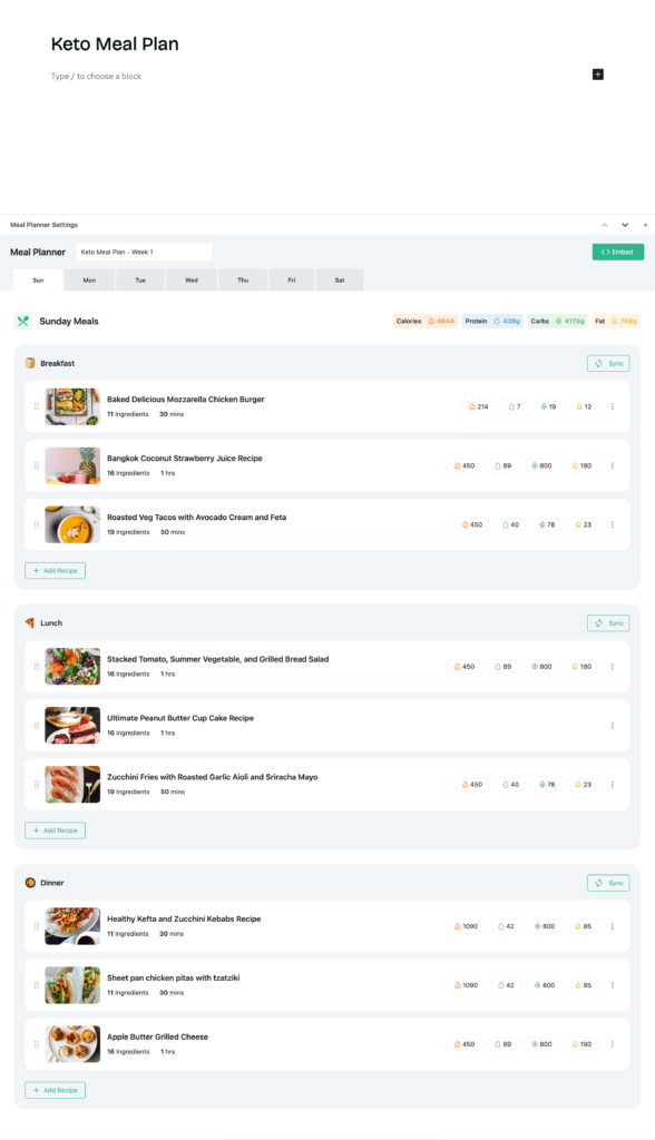- Paste the shortcode into any page or post where you want the Meal Plan to be visible.