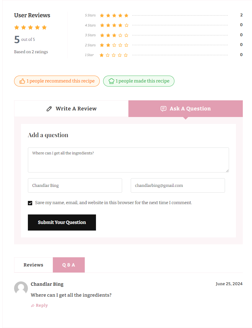 Enable Would you recommend this recipe?: This feature allows you to ask your readers if they would recommend the recipe.