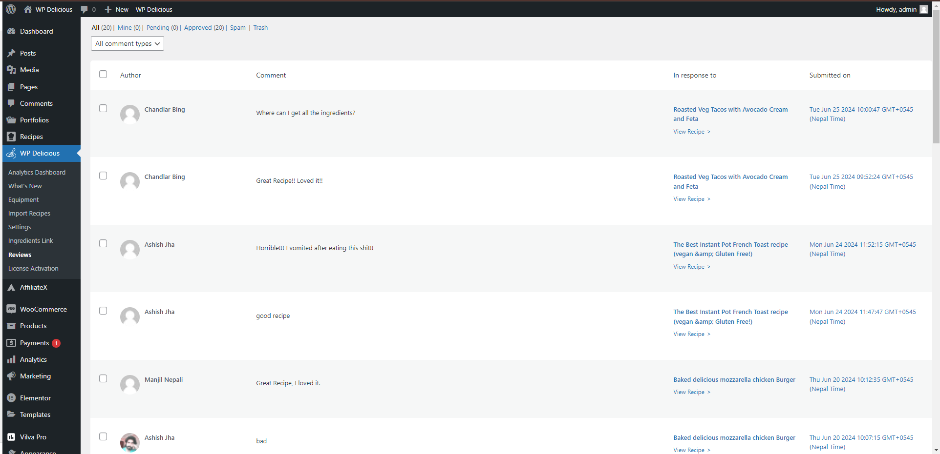 You can choose to Approve, Edit, or Delete the review or mark it as spam via Recipes > Reviews.