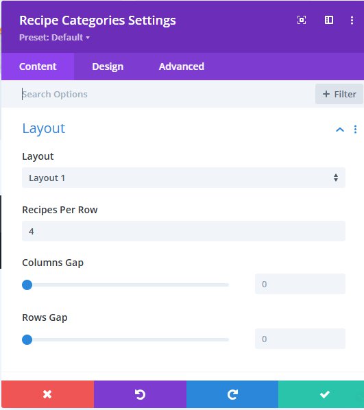 Below are the settings you can configure to set up the Recipe Categories 1: