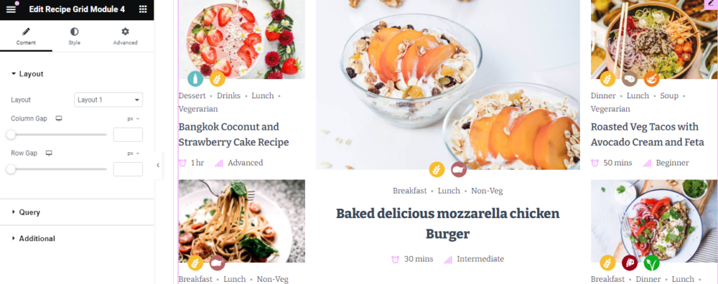 Below are the settings you can configure to set up the Recipe Grid Module 4: