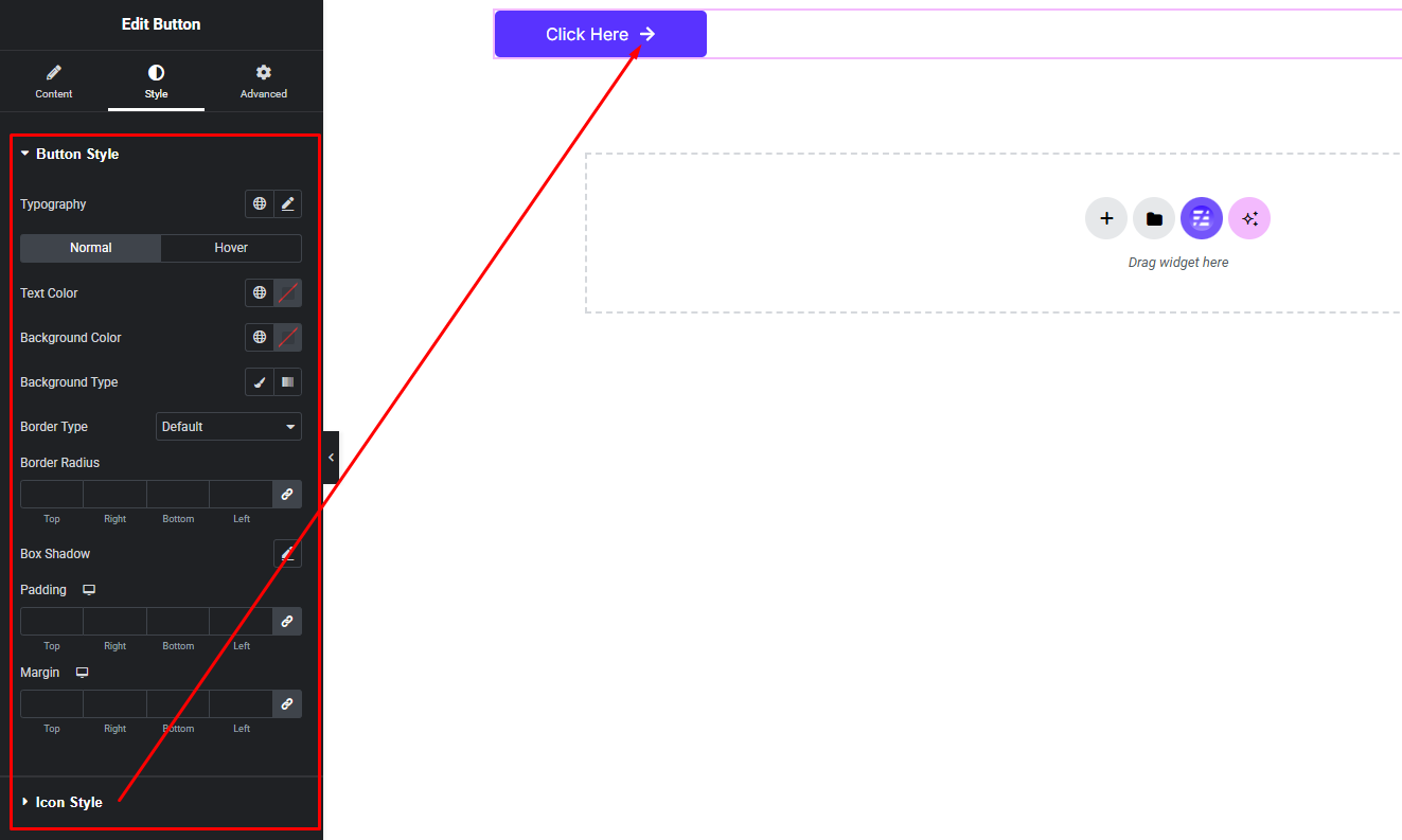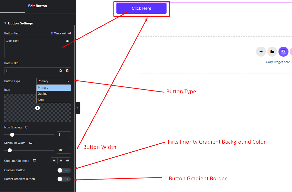 Configure every aspect of your button widget including button types, icon settings, button gradient bg and border and more settings.