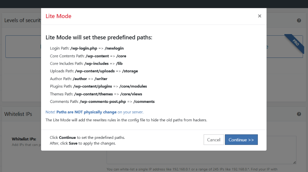 - WP Core Security – customize and hide the WordPress common paths and files. mode details
