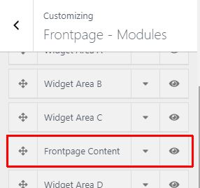 - Add Widgets to the Frontpage Widget Areas (A-L)Note that the only the Active widget areas will be displayed. You can activate/deactivate a widget area by clicking the 'eye' icon as shown in the section above.