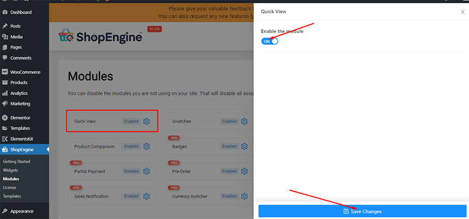 Now, find the Quick View module from the collection of all the available modules of ShopEngine and click the setting icon visible on the module button. After that, enable the Quick View module from the popup window and press the “Save Changes” button.