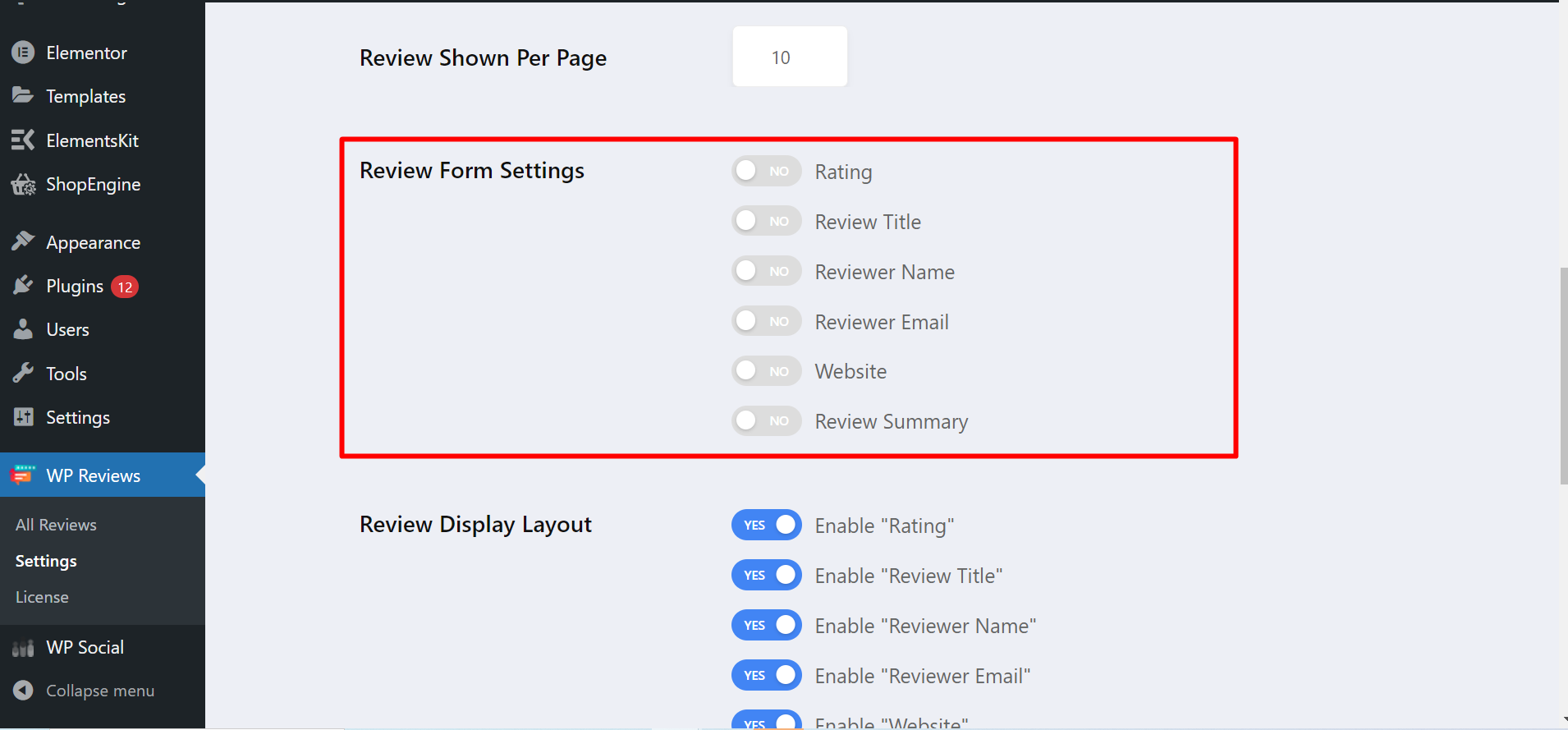 - Review Form Settings – You can adjust the review settings for your forms. For example, you may include Rating, Review Title, Reviewer Name, Review Email, Website, and Review Summary.