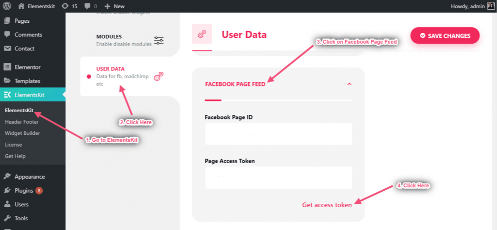 Paso=>8: Ahora ve a Feed de la página de Facebook=> Proporcionar ID de página=> Token de acceso a la página=> Guardar cambios