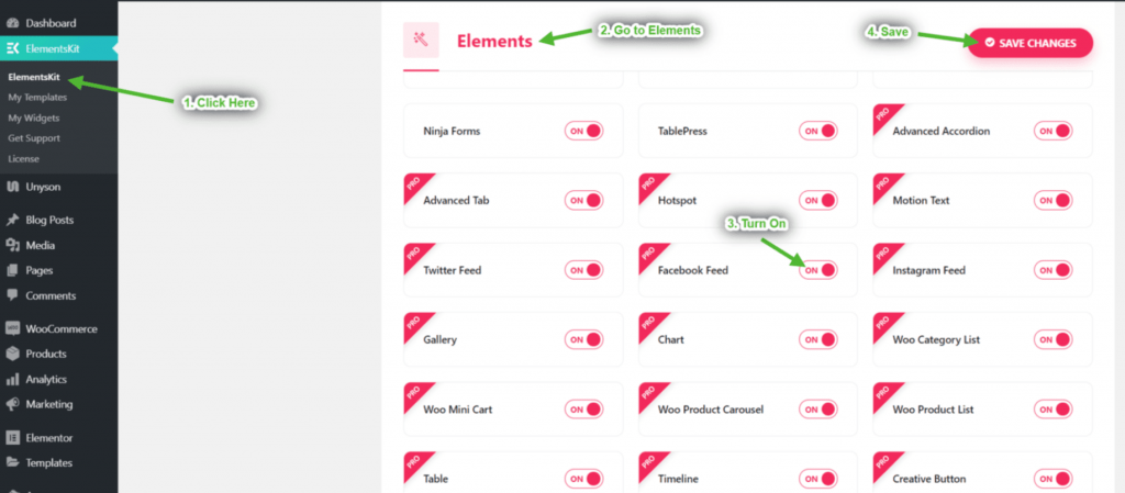 Paso=>1: Ir a kit de elementos=> Elementos=> Asegúrate de que tu Feed de Facebook está activo