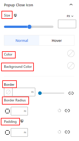 Utilice esta área de configuración para ajustar el tamaño del icono de cierre y su color, el color de fondo, el relleno y todas las configuraciones del borde.