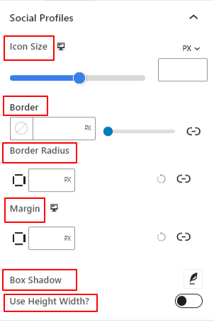 - Usar alto ancho:Habilite este botón para obtener control de altura y ancho del ícono de redes sociales.
