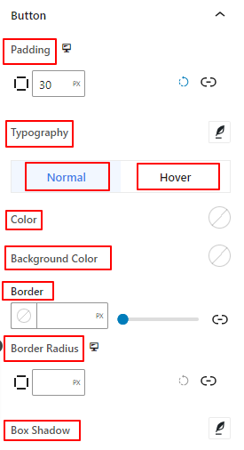 Da qui, aggiungi spazio interno al pulsante e personalizza la sua tipografia e l'ombra del box. Imposta anche il colore per il pulsante e il suo sfondo.