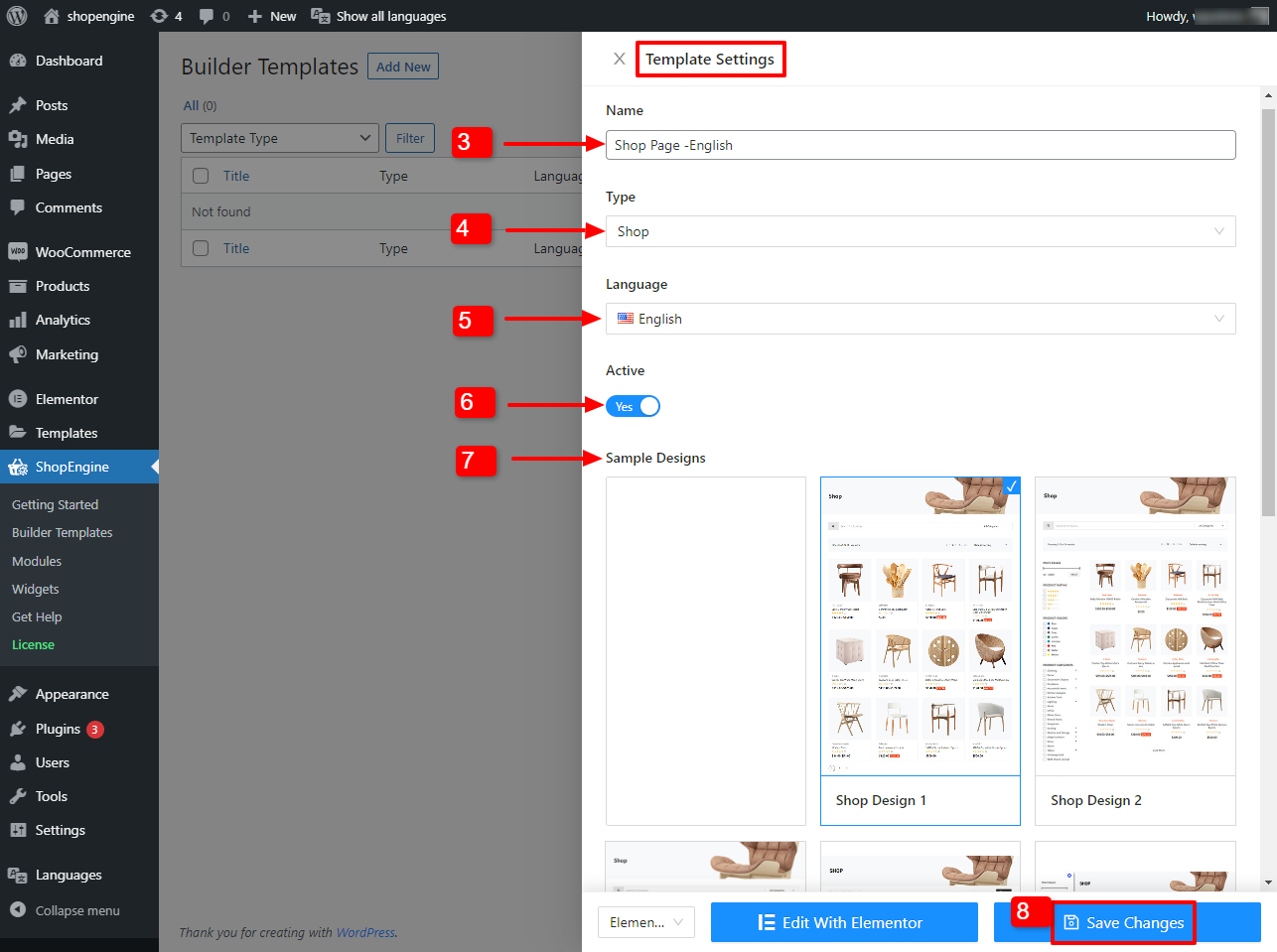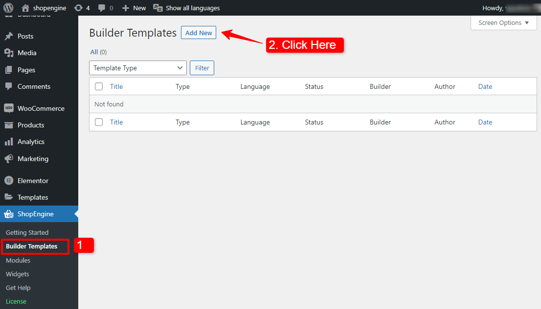 - Navigare verso ShopEngine > Modelli di builder dalla dashboard di WordPress.