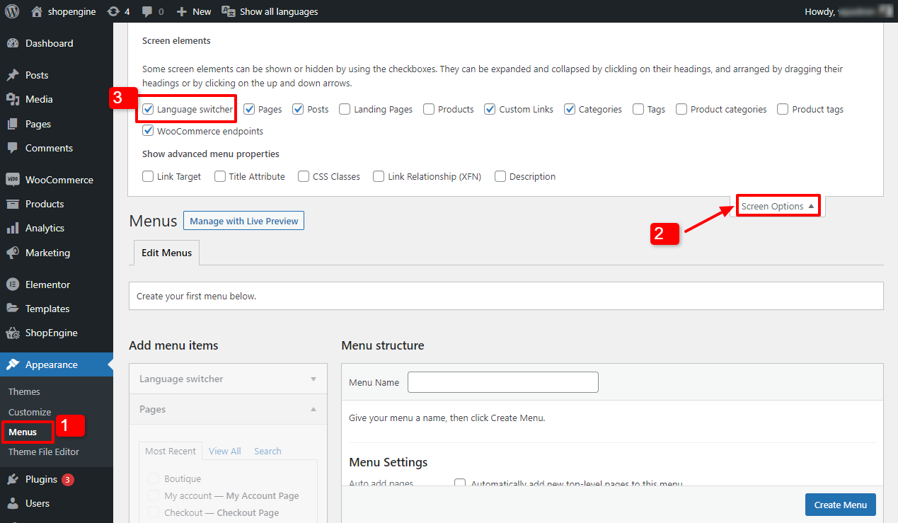 - Successivamente, sotto le voci del menu Aggiungi ed espandi Selettore lingua.