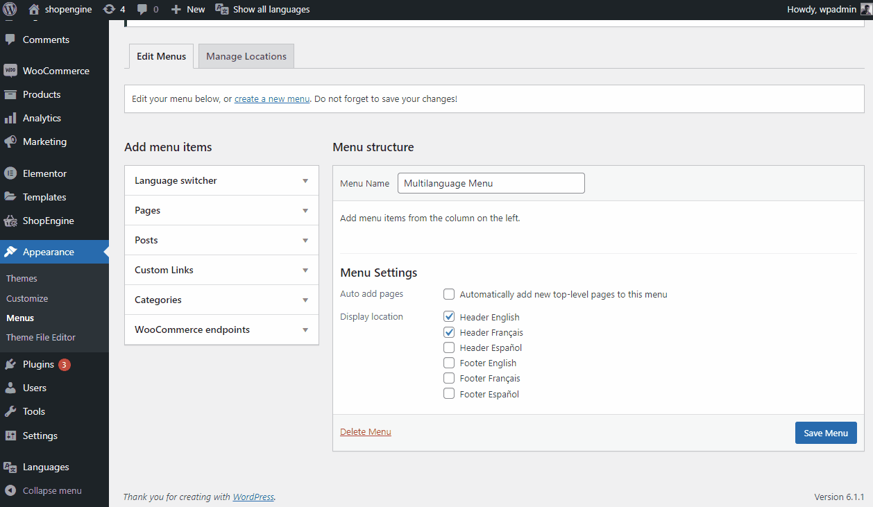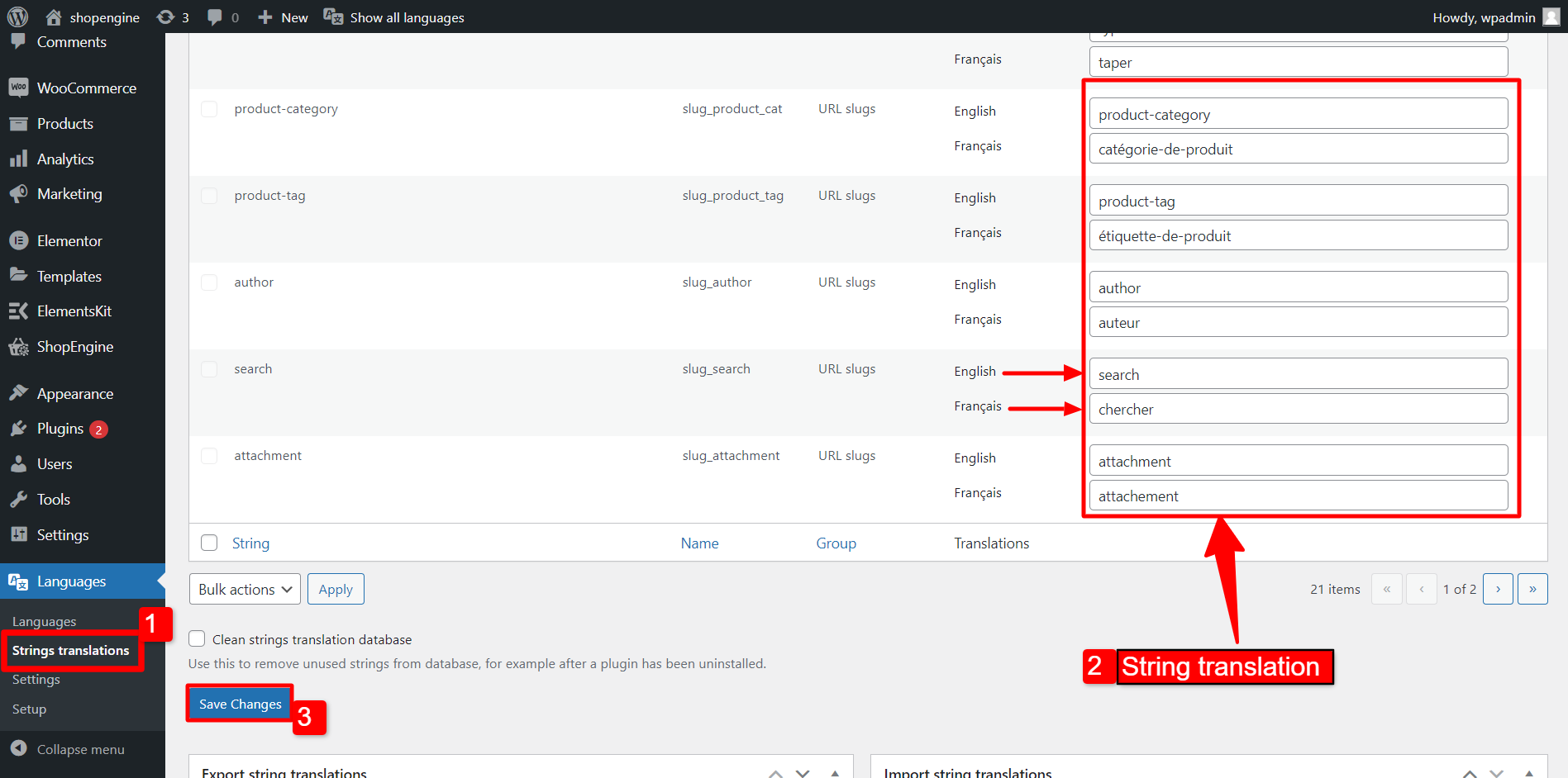 Dopo aver configurato Polylang, puoi tradurre stringhe di testo dei plugin ShopEngine. Per tradurre le stringhe del plugin ShopEngine,