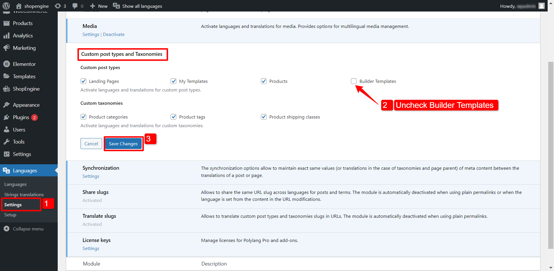 Per consentire a ShopEngine di funzionare correttamente con Polylang, vai a Lingue > Impostazioni > Tipi di post personalizzati e tassonomie.