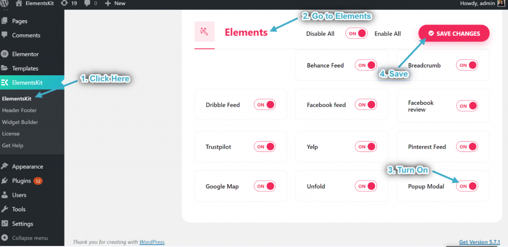 - Vai a ElementsKit=> vai a Elementi=> Assicurati di accenderlo Modale popup=> Fare clic su Salva I cambiamenti.