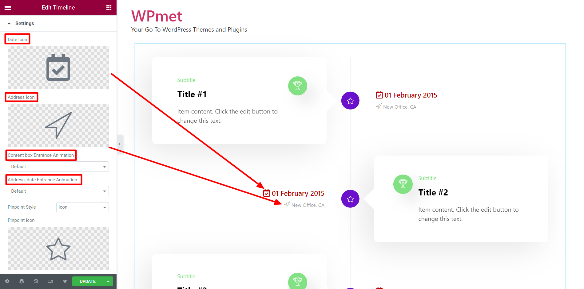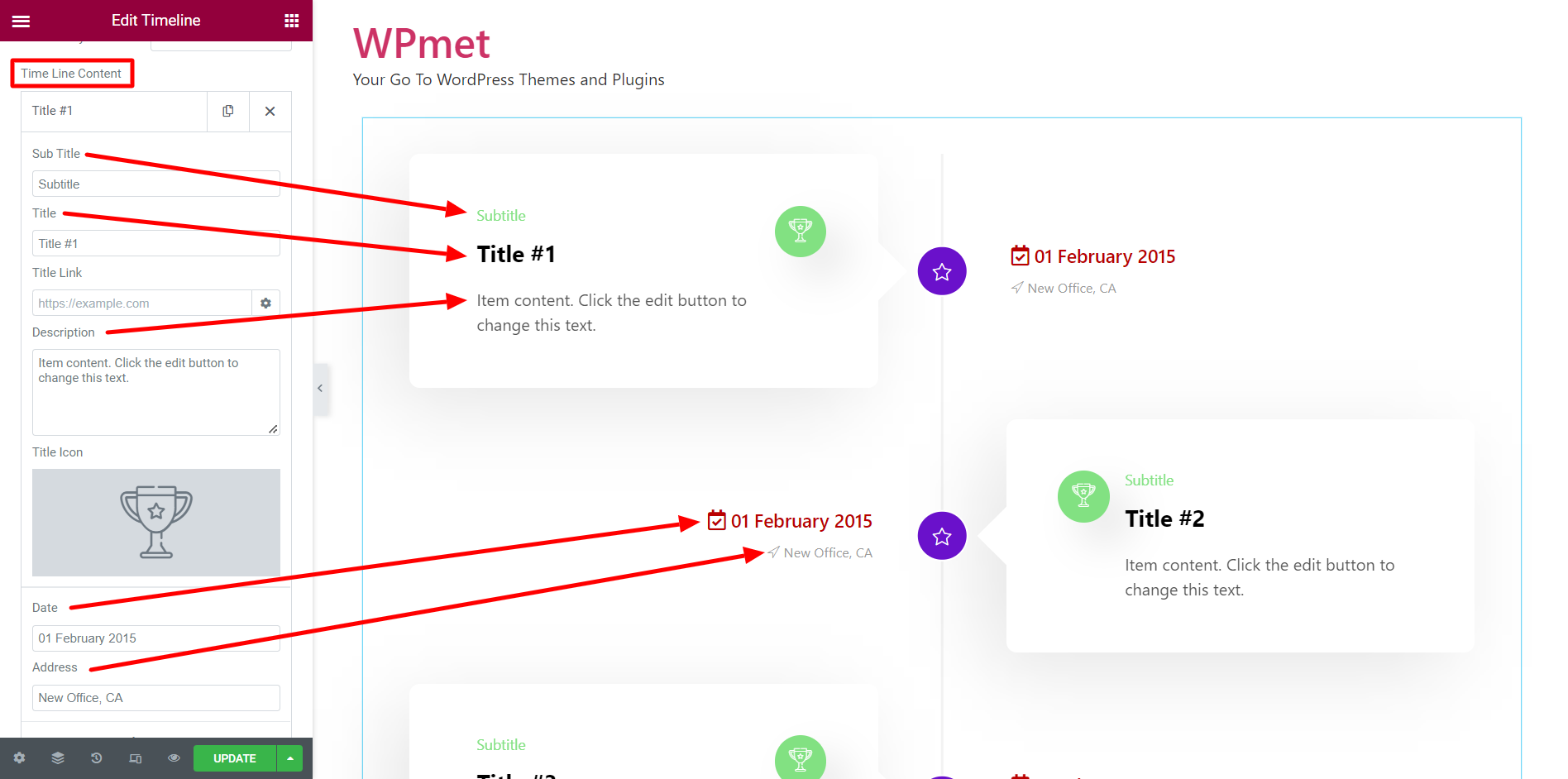 - Dla każdego Treść osi czasu, możesz ustawić tytuł, podtytuł, łącze tytułu, opis, ikonę tytułu, datę na osi czasu i adres.
