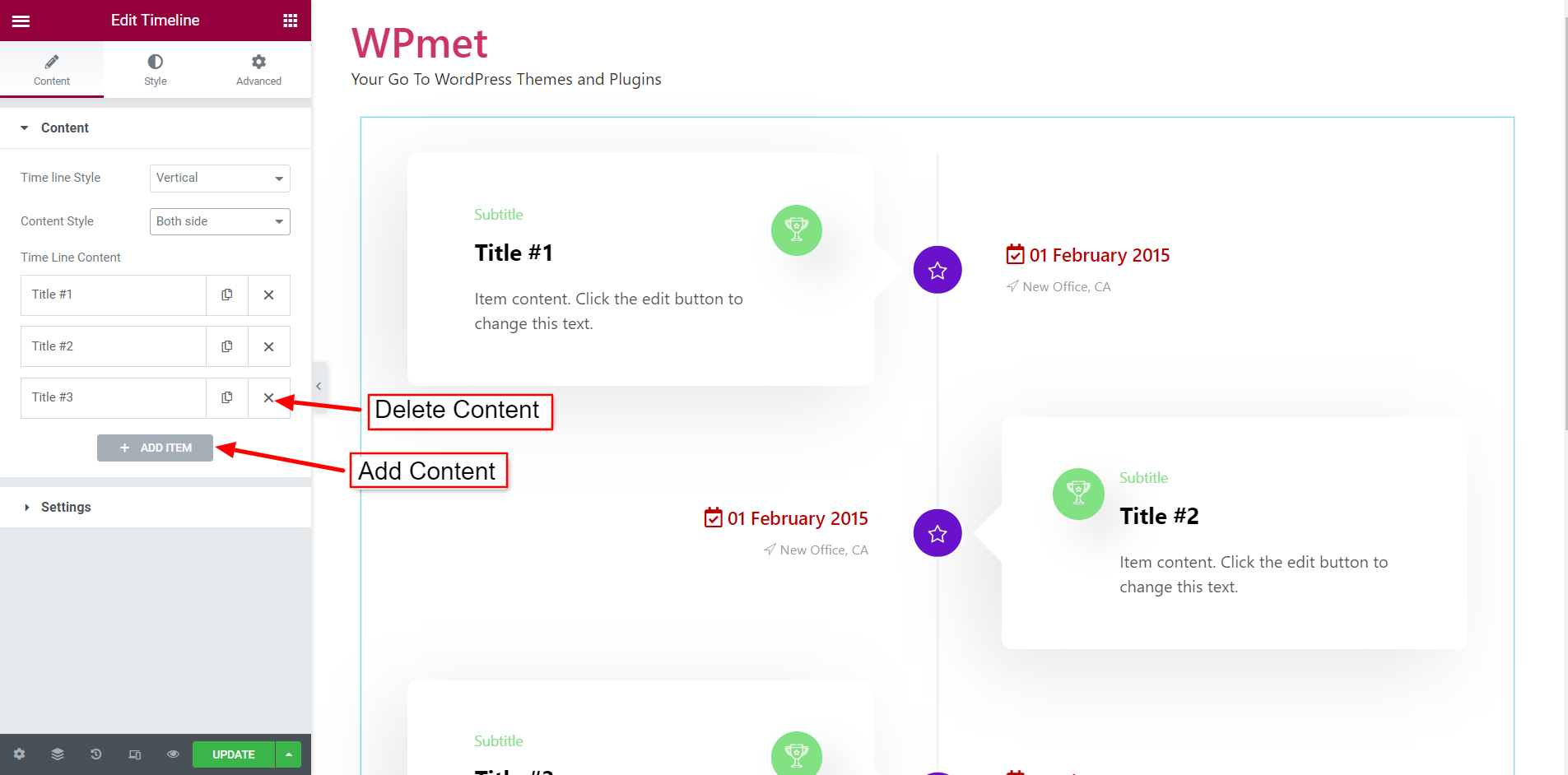 - Możesz uwzględnić Treść osi czasu z DODAJ PRZEDMIOT przycisk. Możesz także usunąć dowolną zawartość, kiedy chcesz.