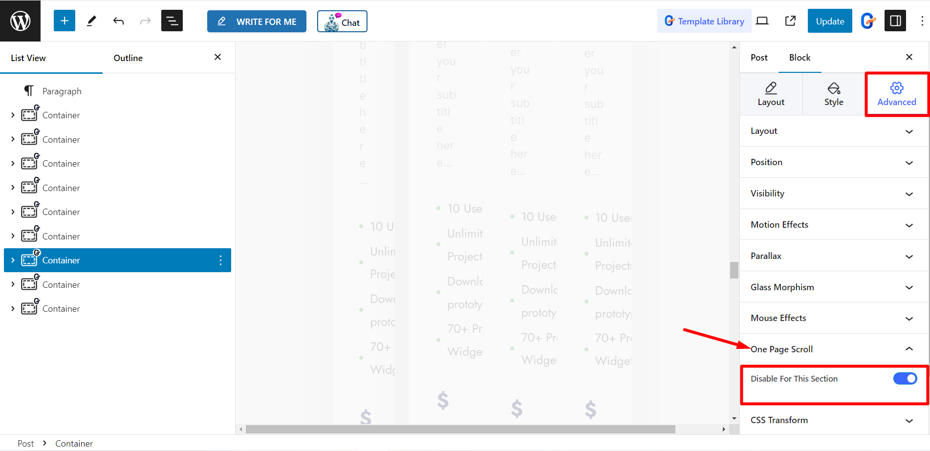 - Selecione a seção para a qual deseja desativar o recurso One Page Scroll