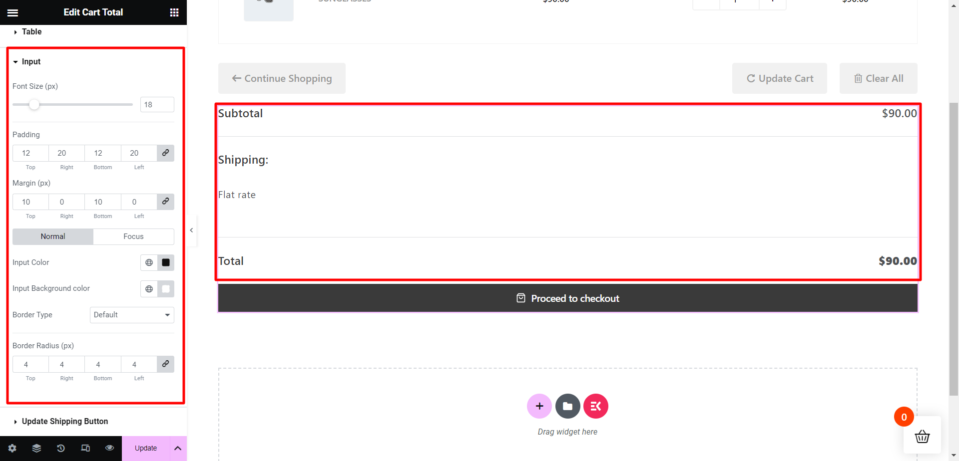 O Cart Total do ShopEngine é outro widget útil que pode incrementar a tabela do seu carrinho. O widget permite alterar diferentes elementos do total do carrinho, como subtotal, total, e prosseguir para o botão de finalização da compra.