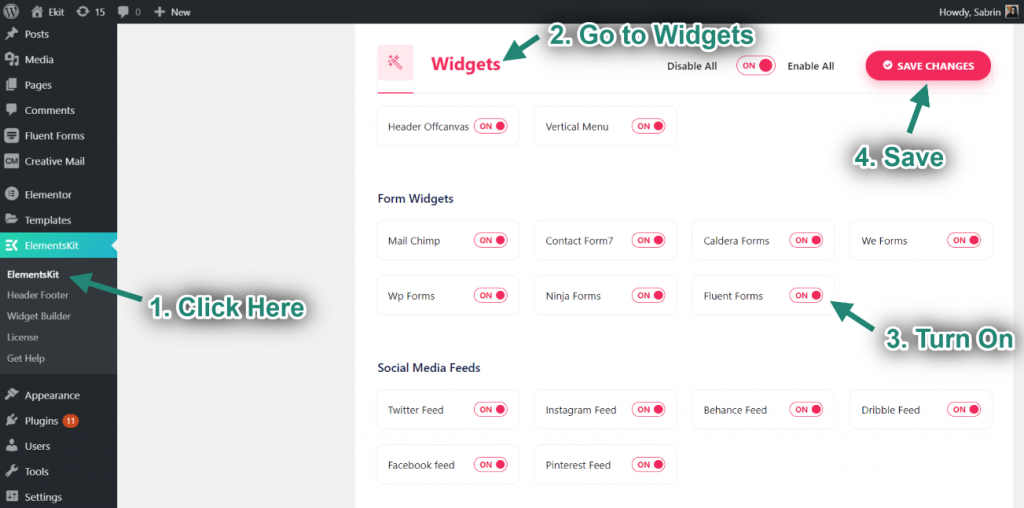 - Gå till Elementskit-> Widgets-> Se till att din Fluent Forms-widget är aktiv-> Spara Ändringar.