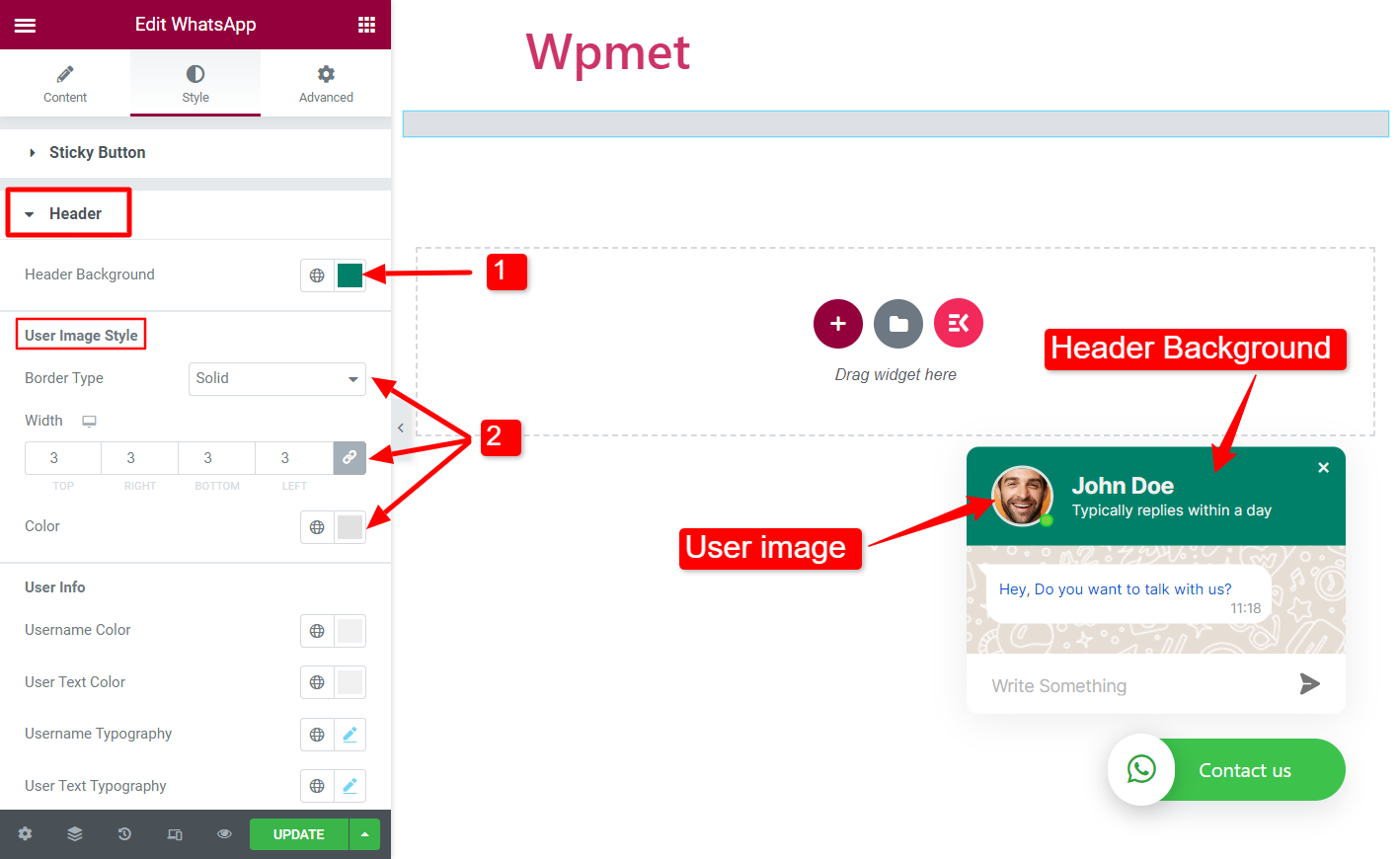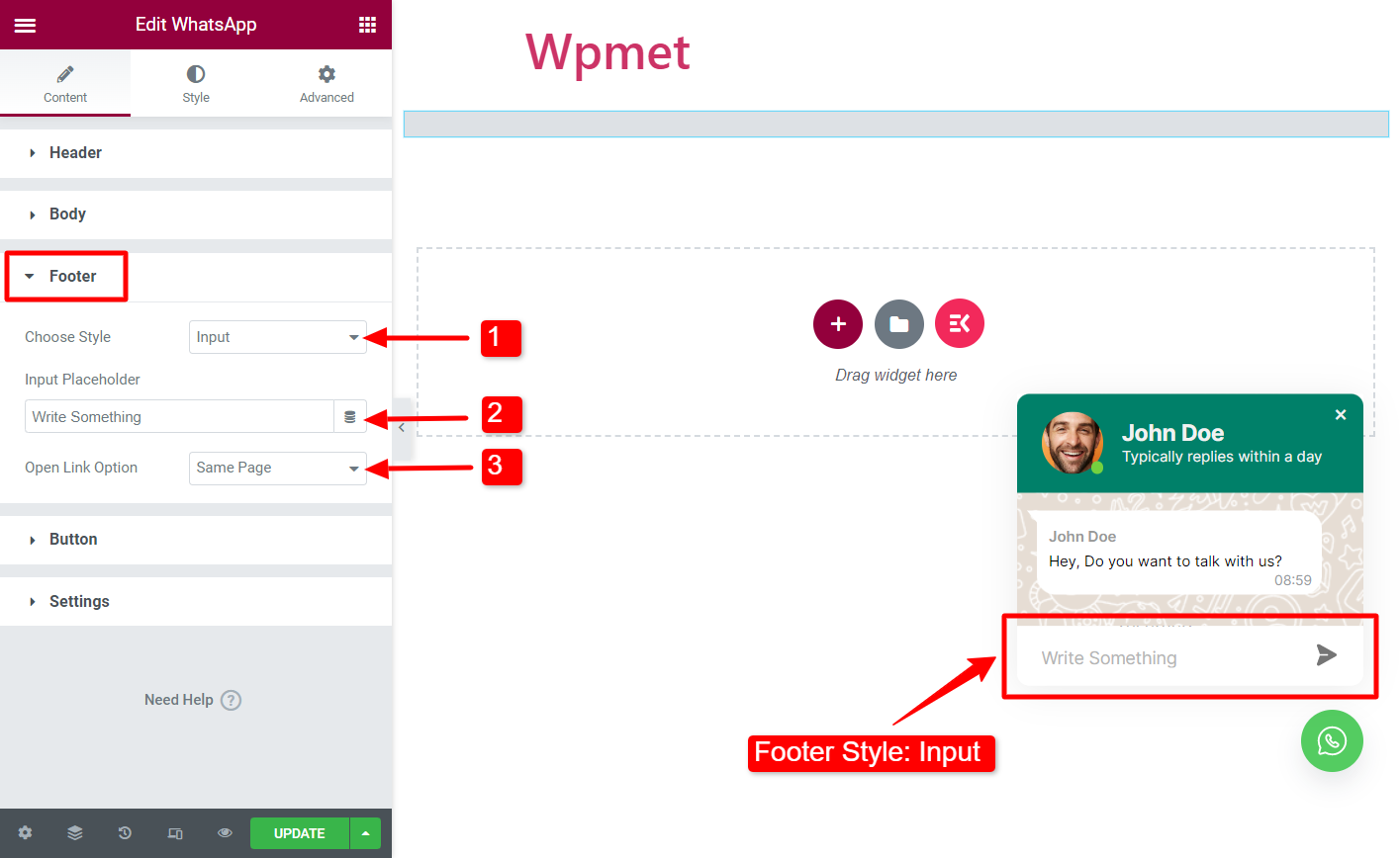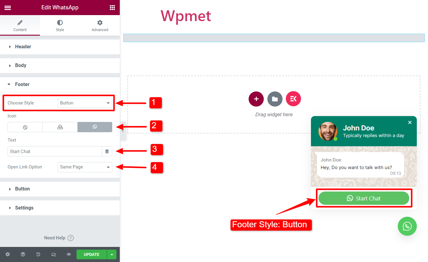 Du kan konfigurera sidhuvud, brödtext, sidfot, knapp och inställningar för ElementsKit WhatsApp-widgeten.