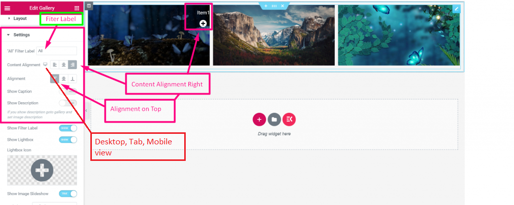 - Innehållsjustering- Välj vy för Desktop, Tab eller Mobile. Efter det om du ställer in Visa Lightbox alternativet som "Visa" och ställ sedan in dess ikon Vänster/mitten/höger av bilden