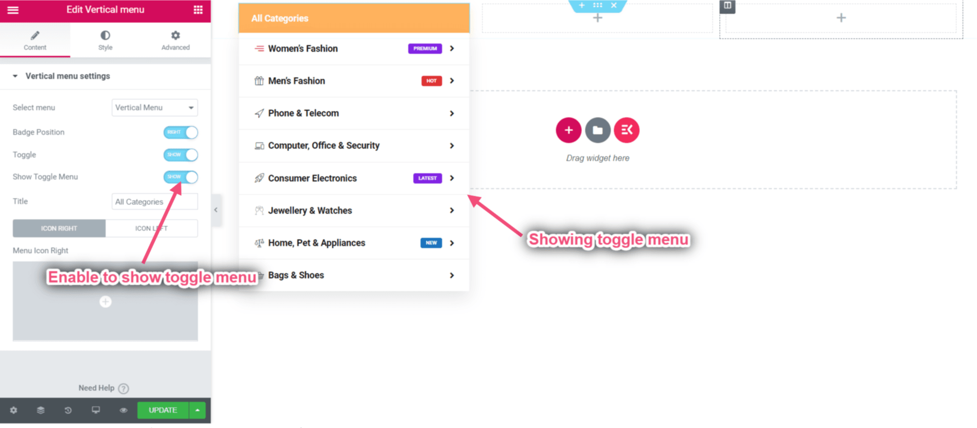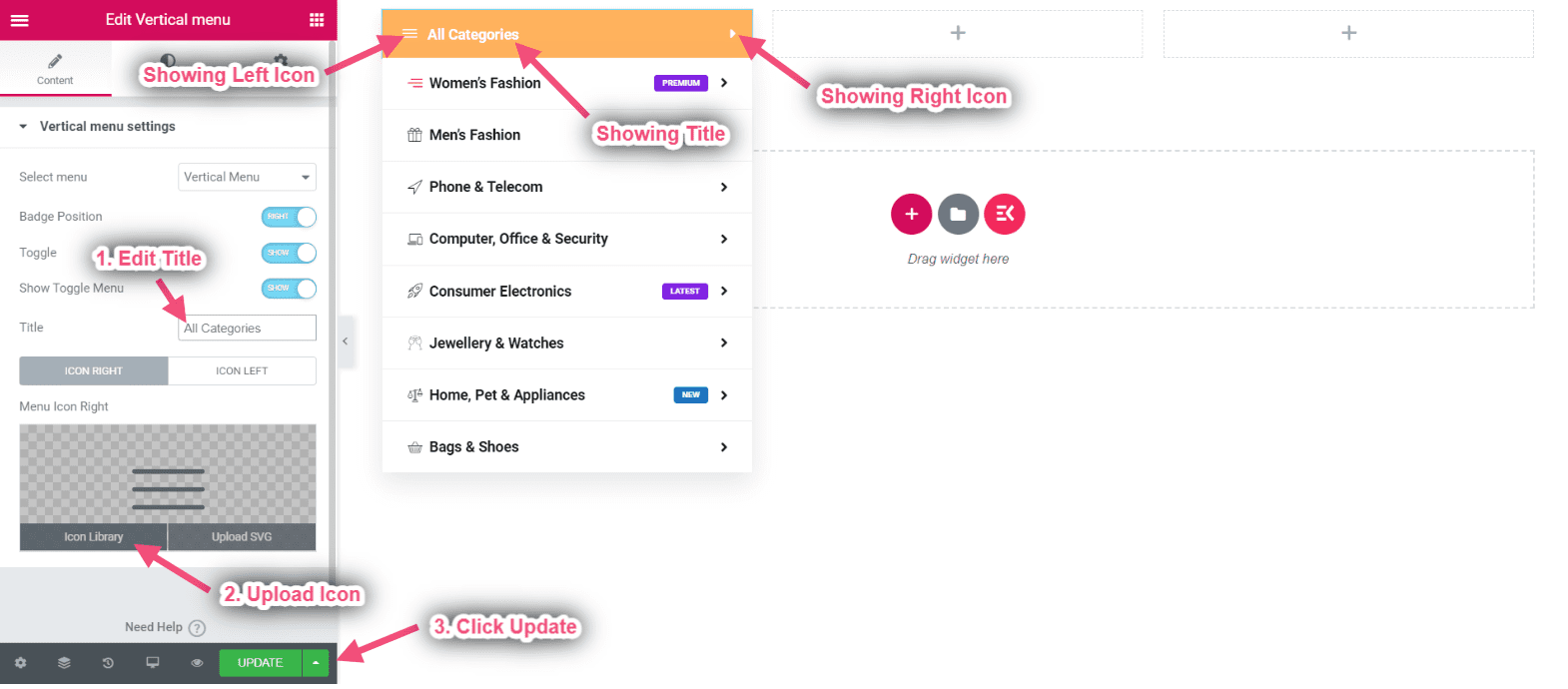 Display the mega menu vertically on your WordPress site with our vertikal megameny widget for Elementor page builder. With our Elementor widget, you can customize your mega menu content, select icons, choose icon color, choose badge text, color, position, etc. Here’s a comprehensive article to explain every method in detail.