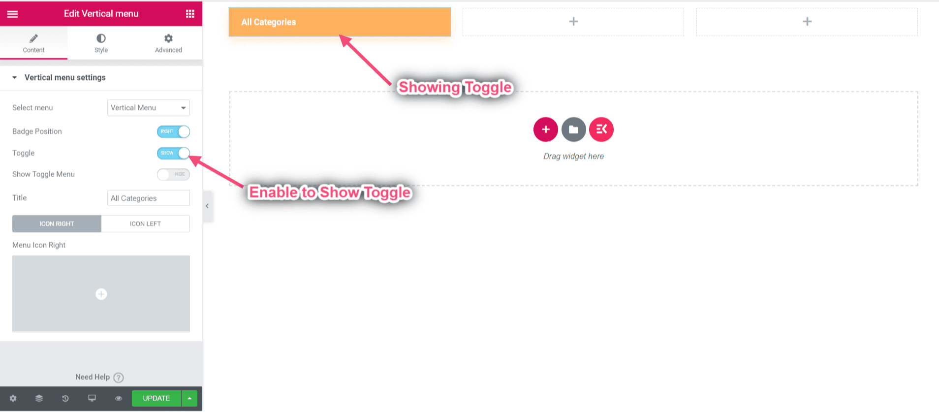 - Se till Vertikal meny är PÅ från ElementsKit → Element.
