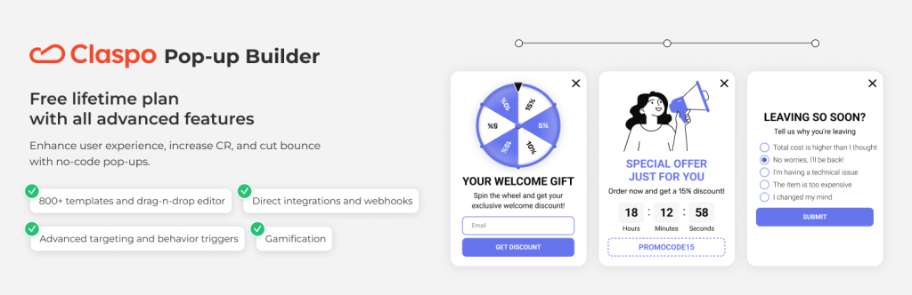 Claspo is a conversion-focused popup builder for WordPress that helps businesses increase trust and drive more sales through targeted onsite messages. While it is widely recognized for lead capture, Claspo can also be used to create social proof notifications, promotional popups, and behavior-based offers that encourage visitors to take action at the right moment.