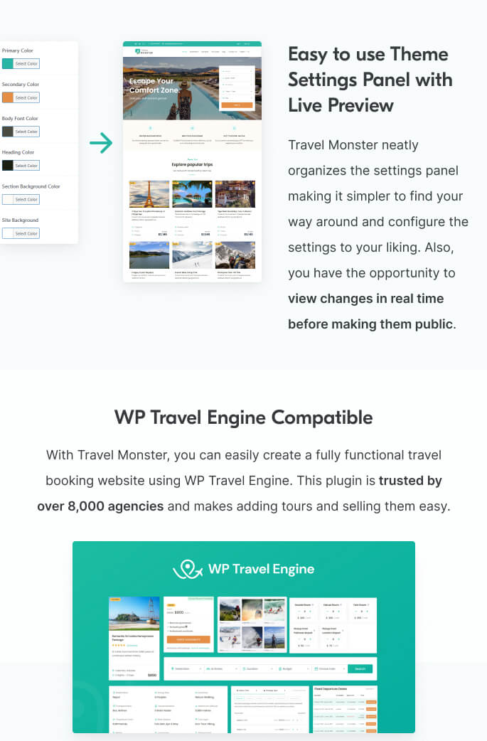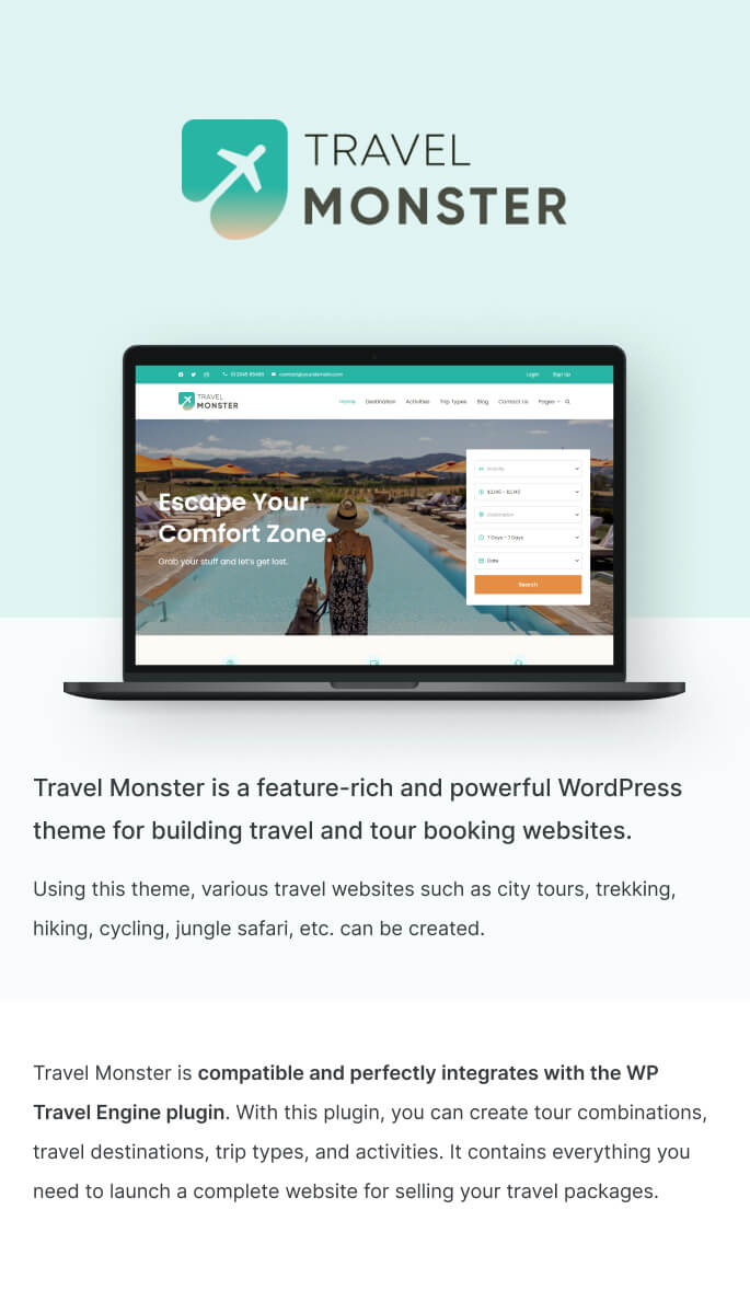 Travel Monster is compatible and perfectly integrates with the WP Travel Engine plugin. With this plugin, you can create tour combinations, travel destinations, trip types, and activities. It contains everything you need to launch a complete website for selling your travel packages.