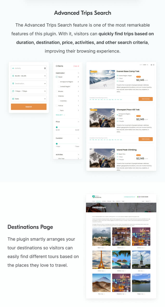 The Advanced Trips Search feature is one of the most remarkable features of this plugin. With it, visitors can quickly find trips based on duration, destination, price, activities, and other search criteria, improving their browsing experience.