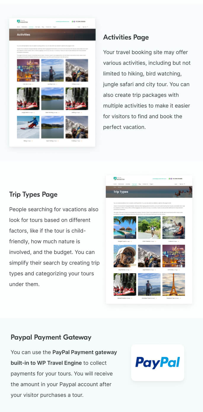 Your travel booking site may offer various activities, including but not limited to hiking, bird watching, jungle safari and city tour. You can also create trip packages with multiple activities to make it easier for visitors to find and book the perfect vacation.