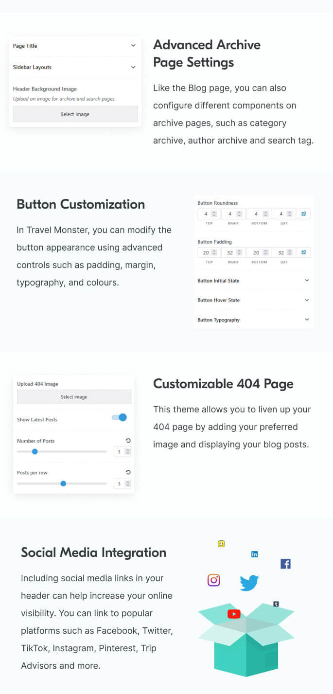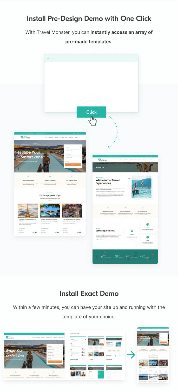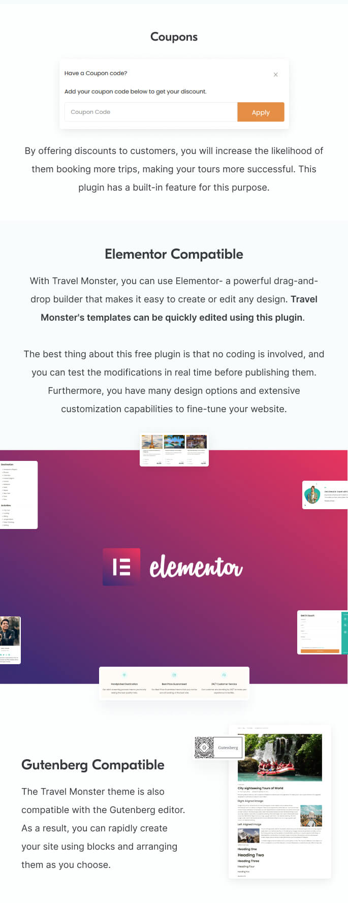 With Travel Monster, you can use Elementor- a powerful drag-and-drop builder that makes it easy to create or edit any design. Travel Monster’s templates can be quickly edited using this plugin.
