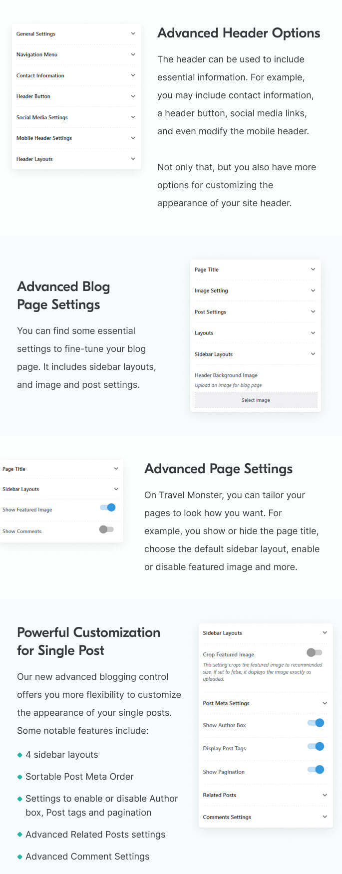 On Travel Monster, you can tailor your pages to look how you want. For example, you show or hide the page title, choose the default sidebar layout, enable or disable featured image and more.