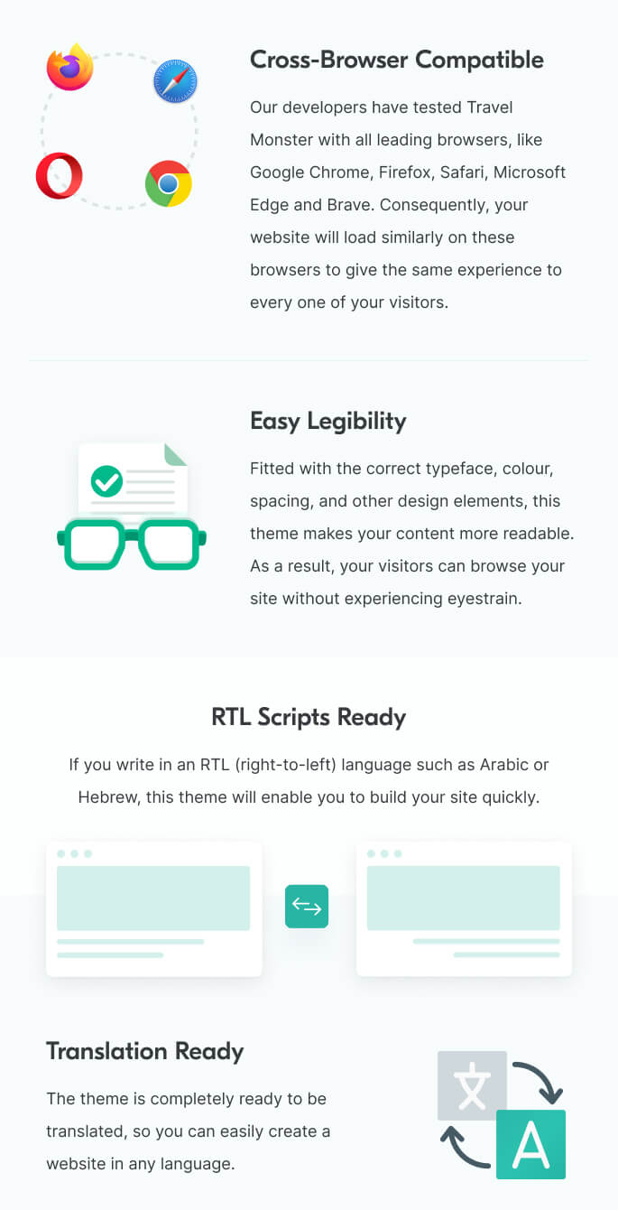 Our developers have tested Travel Monster with all leading browsers, like Google Chrome, Firefox, Safari, Microsoft Edge and Brave. Consequently, your website will load similarly on these browsers to give the same experience to every one of your visitors.