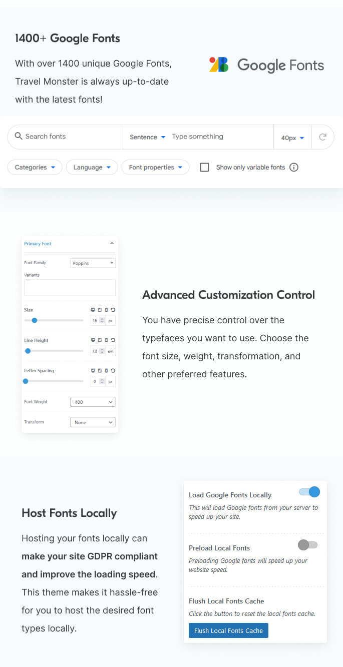 With over 1400 unique Google Fonts, Travel Monster is always up-to-date with the latest fonts!
