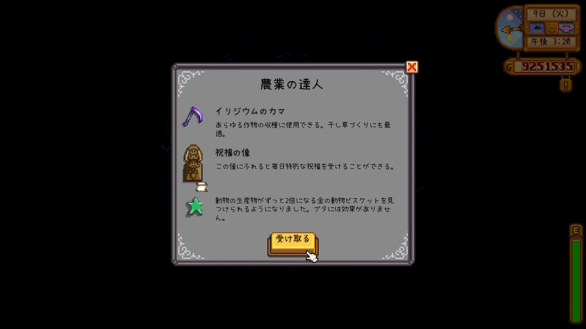農業の達人で一番うれしいのはやっぱり「祝福の像」の効果ですね