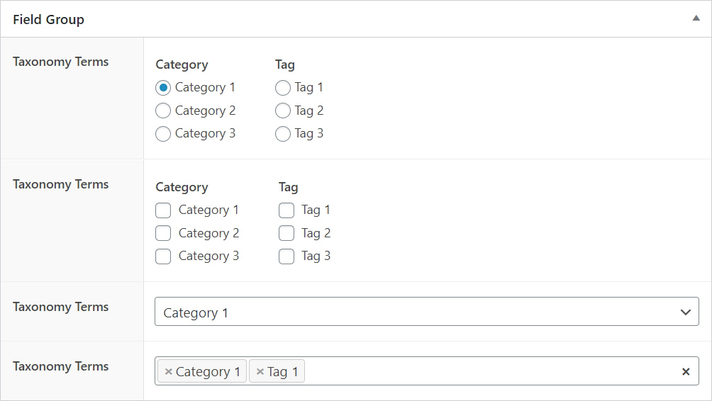 | Allow Taxonomies | Filter which taxonomy can be chosen |