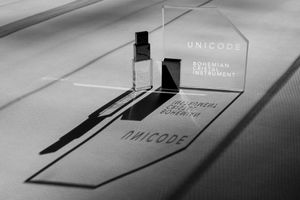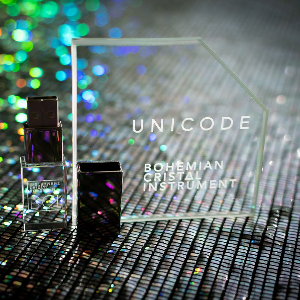 Limited edition of the physical version of UNICODE EP in the shape of a unique glass object with a metallic / glass drive.