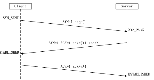 (2)第二次握手:Server收到数据包后由标志位SYN=1知道Client请求建立连接,Server将标志位SYN和ACK都置为1,ack=J+1,随机产生一个值seq=K,并将该数据包发送给Client以确认连接请求,Server进入SYN_RCVD状态。