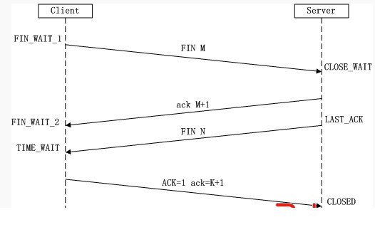 (4)第四次挥手:Client收到FIN后,Client进入TIME_WAIT状态,接着发送一个ACK给Server,确认序号为收到序号+1,Server进入CLOSED状态,完成四次挥手。