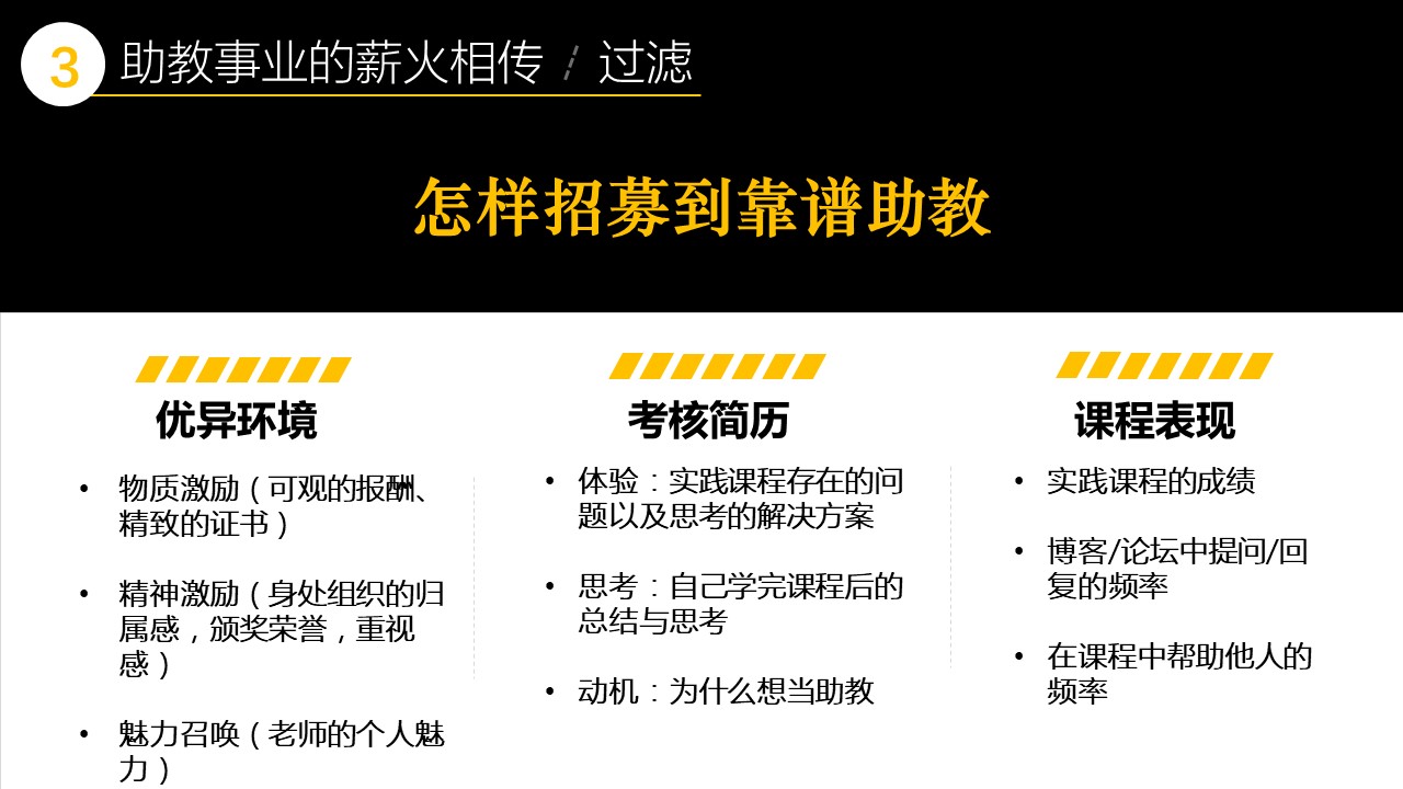 助教在课程中的重要程度我们在上文中已经反复说明了,那么接下来,为了让助教、老师与课程三者相得益彰的生态得以保持,我们必须解决课程中一个重要的问题:作为课程的教师,我该如何寻找新的助教呢?