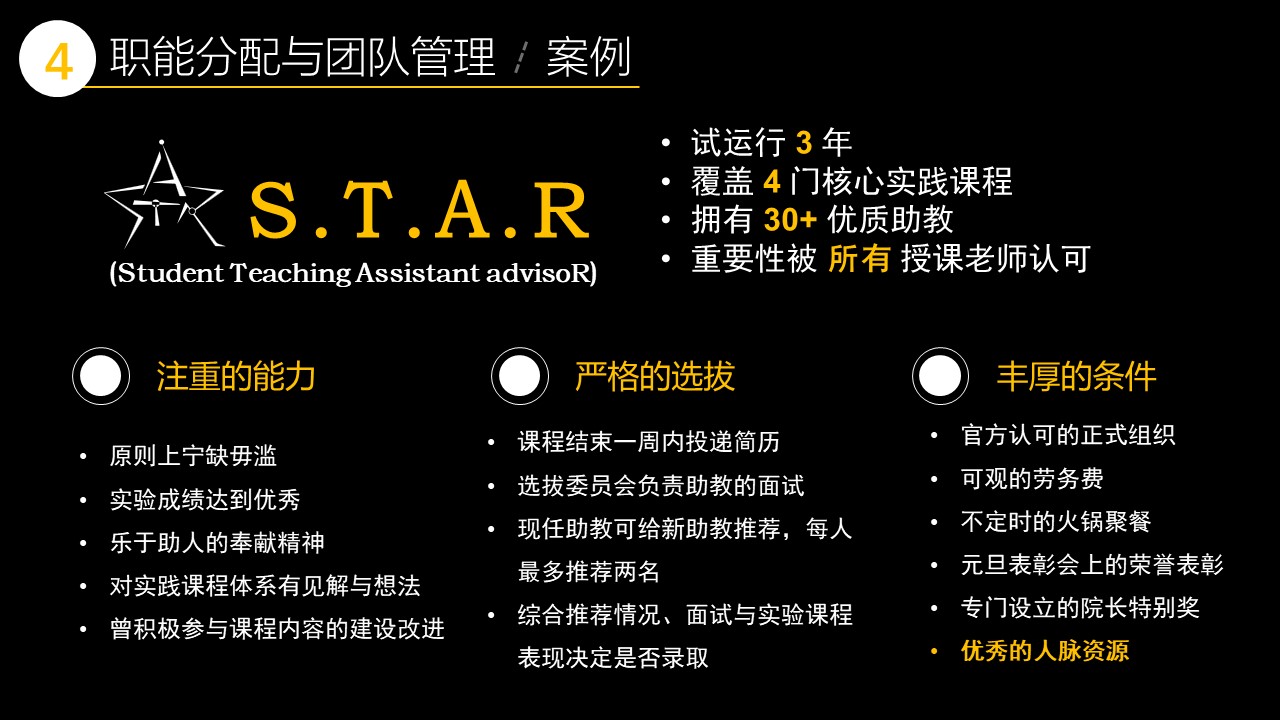 - 助教的选拔是课程决策中非常重要的一环。老师需要创造优秀的条件,吸引优秀助教的加入。