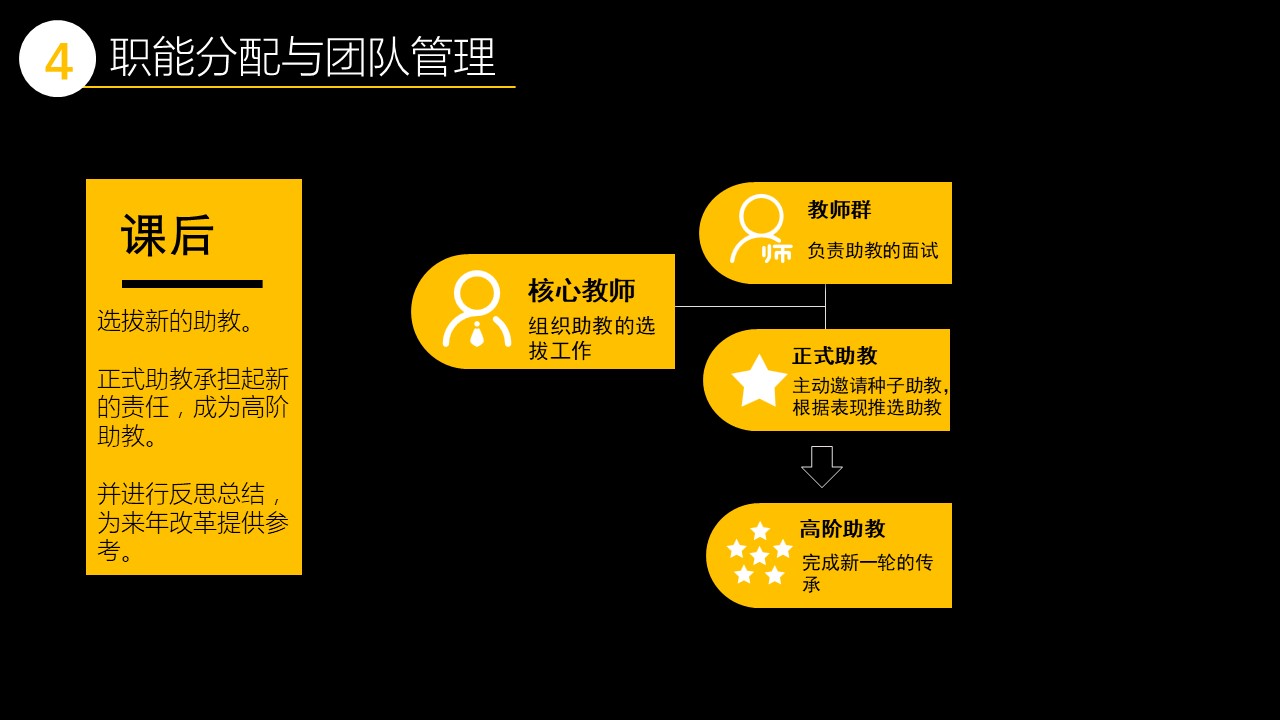 - 新助教不知道如何上手。这就需要老助教带新助教,一代传一代,形成一个传承的系统。