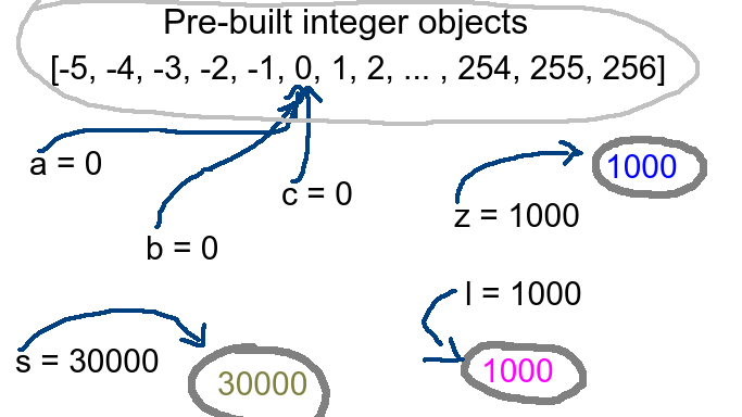 Now, if you initialize an integer with a value between this range, the Python interpreter reuses a corresponding pre-built integer object instead of creating a new one. So a variable between -5 and 256 always references the same pre-built integer object.