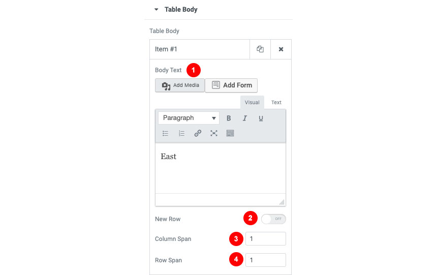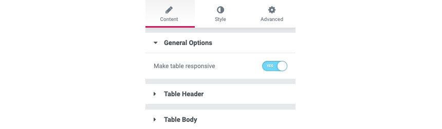 Under the Content tab, you can select whether you want your table to behave responsively on mobile devices and adjust your table header and body.